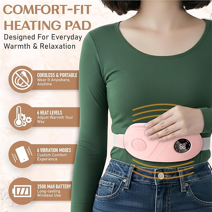 • Heating Pad for Pain Relief with Massage Power – This wearable periods cramp massager works as a modern heating pad for pain relief, delivering soothing warmth and vibration to support daily period pain relief products at home, work, or travel.